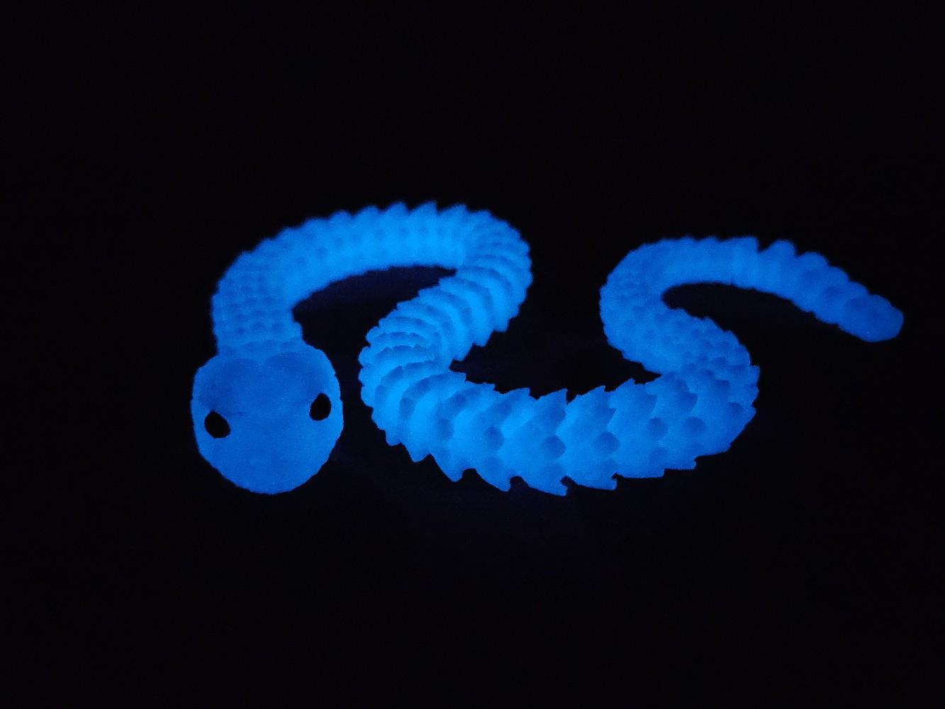 Whether you're looking for an attention-grabbing decor item or simply want to add some unique flair to your collection, our 3D Printed Glow in the Dark (Blue) with Red eyes Articulated Snake is sure to impress. So why wait? Order yours today and start enjoying its stunning beauty right away!